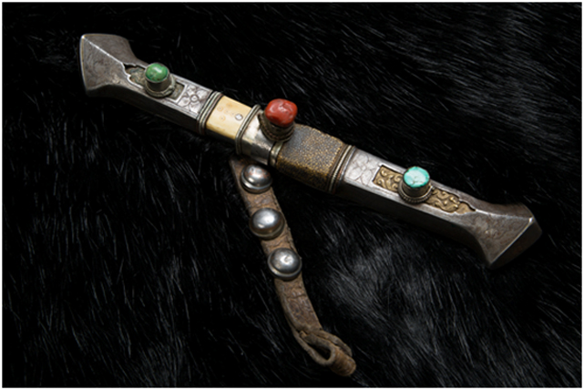 安多地區(qū)主要以放牧為主,牧民的刀主要用于宰殺和吃肉,有嚴(yán)格的男用女用之分,男式刀長度在一尺以上,女式刀在一乍左右,刀鞘的底部和刀柄的末端上翹,呈船形。安多人喜歡珠寶,頭飾、胸飾、腰飾無不光燦耀人,這些飾物同樣被用在刀上,刀鞘和刀柄錨金錯銀,鑲嵌著珊瑚和綠松石,像精美的藝術(shù)品。
