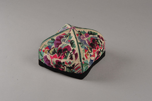 “曼甫朵帕”此款花帽是由手工刺繡成的,四瓣以帽頂為中心拼接縫合,套模成型,以黑絨鑲邊,四棱可折疊。每一瓣三角形內以一個或兩個單獨紋樣,一條邊緣紋樣構成一組適合紋樣,這種紋樣簡練、構圖嚴謹?shù)幕眻D案稱為單獨適合紋樣花帽,維吾爾語稱“曼甫朵帕”。此花帽紋樣大都是以新疆花卉、果實等自然形態(tài)為素材,加以藝術的提煉、概括、夸張、變化而使之成為具有濃郁鄉(xiāng)土氣息和強烈民族情趣,圖案有花卉、果實,造型有石榴花、桃花、杏花、麥穗,還有星月、雪花等。此外還大量運用了富有變化的幾何圖案。布底為一色平線,圖案則用優(yōu)質彩色絲線混合棉線刺繡而成,形成底色和花色對比強烈,艷麗奪目。
