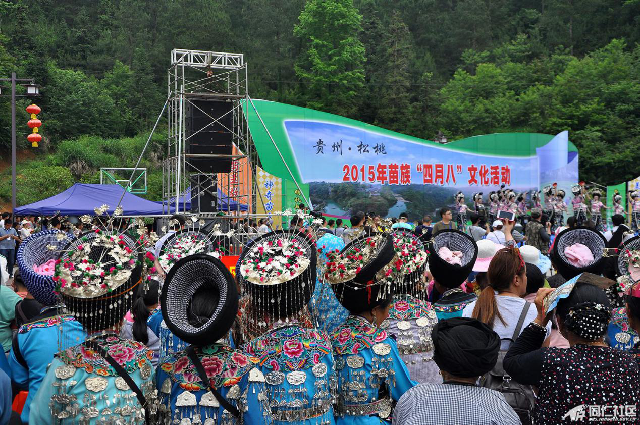 “四月八”的由來傳說甚多,主要是為憑吊“四月八”葬于今噴水池一帶的古代苗族英雄,輩輩相傳,而成習俗。傳說古代有一個名叫“亞努”的苗族首領,領導苗民向統(tǒng)治者進行斗爭。他曾組織各寨苗族頭人在“喝血坳”地主喝雞血,發(fā)誓共同聯(lián)合,戰(zhàn)斗到底。并約定四月八日在某山聚眾起義。起義后,義軍連連獲勝,一直打到了四川、貴州。第二年的四月八日,亞努不幸戰(zhàn)死在貴陽市的噴水池附近。苗族人民為了紀念這位民族英雄,便于每年的四月八這一天,舉行紀念活動,追思亞宜的業(yè)績,為戰(zhàn)死者掃墓。清代乾嘉苗民起義后,統(tǒng)治者禁止湘西苗族人民舉行這一活動,新中國成立后經國家民委批準,將“四月八”定為苗族統(tǒng)一的節(jié)日(圖為2015年貴州松桃苗族“四月八”節(jié)慶盛況,引自貴州銅仁政府網“同仁社區(qū)”)。