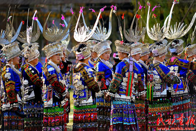 過苗年時,貴州苗族未婚少女穿戴起了體現家庭財富的銀飾。郭建軍攝影,引自民族畫報