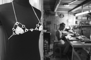 “銀飾胸罩”重約200克。據(jù)龍?zhí)柦榻B,他打制“銀飾胸罩”源于對(duì)妻子的愛。妻子長(zhǎng)期在田間勞作,夏季汗水貼著內(nèi)衣,悶熱難受。于是,龍?zhí)枦Q定給老婆打制一件精致、涼爽的“銀飾胸罩”。這件耗時(shí)33天制成的“銀飾胸罩”,是用發(fā)絲般纖細(xì)的銀絲制成的,穿著舒適涼爽。