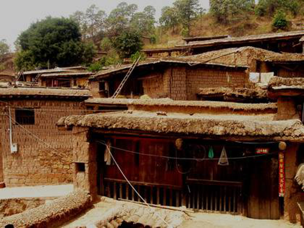 彝族是農(nóng)牧兼營(yíng)的民族,村寨的分布與坐落有其獨(dú)特的傳承。彝族的村寨多坐落在海拔2000~3000米的山區(qū)、半山區(qū),相沿聚族而居。為適應(yīng)西南地區(qū)亞熱帶氣候和山地特點(diǎn),彝民們便就地取材,以一種最容易、最節(jié)省錢(qián)財(cái)人力的建房方式,創(chuàng)造出中國(guó)建筑的獨(dú)特樣式——土掌房。土掌房多建于山地斜坡上,以石為墻基,用土坯砌墻或用土筑墻,墻上架梁,梁上鋪木板、木條或竹子,上面再鋪一層土,經(jīng)灑水抿捶,形成平臺(tái)房頂,不漏雨水。有的大梁架在木柱上,擔(dān)上墊木,鋪茅草或稻草,草上覆蓋稀泥,再放細(xì)土捶實(shí)而成。