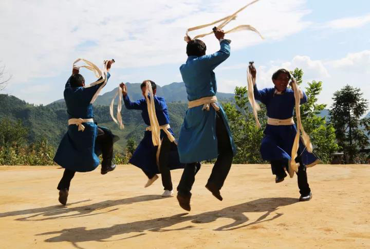 “鈴鐺舞”主要流傳在烏蒙山區(qū)的彝族聚居區(qū)。彝語稱“懇合唄”?!皯┖稀?,指祭祀禮儀中唱經文的歌,“唄”即跳的意思,又稱“跳腳”、“抄子舞”。合起來就是通過舞蹈表演的形式加上歌師的訴唱來祭奠死者的意思,是彝族先民在祭祀教化活動時按倫理輩分和長次舉行高歌創(chuàng)業(yè)公德的騎馬戰(zhàn)狀舞蹈。