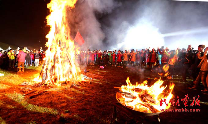 來觀看火把節(jié)的觀眾密密麻麻坐滿火把場周圍的山坡,場面十分壯觀