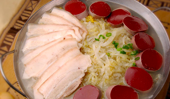 滿族有灌制血腸的習(xí)俗。多在臘月殺豬時(shí)制作。用豬血,加鹽、姜、辣椒粉、味精的調(diào)勻,灌入豬小腸之中,所用腸以不足二尺為宜,兩端用細(xì)繩扎牢,血漿不可充的太滿,以免煮時(shí)脹裂。煮到一定程度時(shí)要用一干凈的鋼針在腸上刺一些針眼,一則排放氣體以免膨脹迸裂,二則掌握火候,一俟沒(méi)有血水自針孔洞中滲出,即撈出冷開水或冷水中。食時(shí)片成片,可以直接夾食,也可以醮以醬油、醋、蒜泥、姜汁、辣椒油等食用。既鮮美爽口,又多食不膩,佐酒下飯均宜。