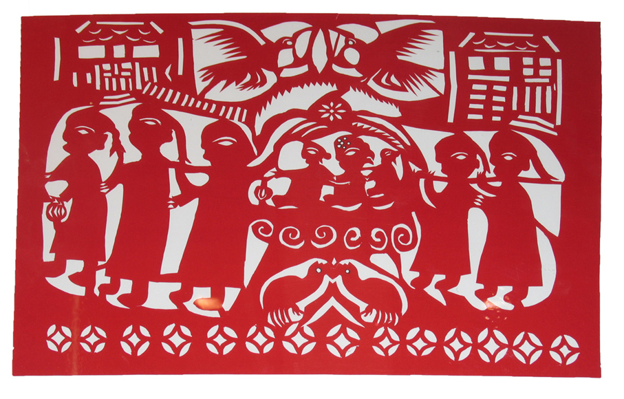 其實(shí),這樣一種民間工藝,早在清代,就已堂而皇之地登上了朝廷大雅之堂。如皇帝舉行婚禮作洞房的神寧宮,墻壁就按滿(mǎn)族習(xí)俗裱紙,四角貼著雙喜字剪紙角花,頂棚中心貼著龍鳳團(tuán)花剪紙。在宮殿兩旁的過(guò)道壁上也貼有角花。據(jù)說(shuō)有人用紙剪成有鹿、鶴、松的“六合春”圖案,加以彩繪,貼于朝服覲見(jiàn)慈禧太后,連她都以為是繡出來(lái)的。
