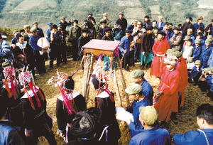 寨子里響起了鞭炮聲,整個(gè)寨子都熱鬧起來(lái)。師父?jìng)儙е智巴茏蛹抑鞒謨x式。即將受戒的十多個(gè)男孩分坐兩排,前排的用被子蒙著頭,后排的帶著草帽,不讓人看見(jiàn)他們的臉。在歌手的歌聲和樂(lè)聲中,開(kāi)始了一項(xiàng)項(xiàng)受戒儀式。從天明到黑夜都在不停地進(jìn)行著。