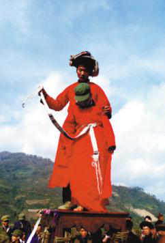 “跳五臺(tái)”可算是儀式中較為引人注目的。在村邊的一塊場(chǎng)地中央搭好一座約兩米高的木臺(tái),叫做“五臺(tái)”。受戒的弟子們同樣帶著草帽,身穿紅袍,由師父帶領(lǐng)走向五臺(tái)。在鑼鼓聲中,繞五臺(tái)三圈,繞畢盤腿坐好。師傅叫到誰(shuí),誰(shuí)就起來(lái),在師父的指引下,沿木梯爬上高臺(tái)。蹲在五臺(tái)上的受戒者,雙手十指交錯(cuò),小心翼翼地向后移動(dòng)到桌邊,然后翻落于藤網(wǎng)之中,由網(wǎng)中的棉被將受戒者包住。師父掀開(kāi)棉被,見(jiàn)受戒者十指仍然穩(wěn)扣,坐像端端正正,表示度戒成功。十幾位弟子輪番上臺(tái),每位都順利通過(guò)。受戒弟子的父母和鄉(xiāng)親們都為他們的成功而歡喜。