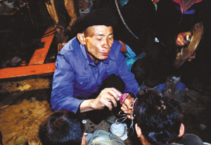 這天,我們剛好在縣里采訪,聽(tīng)說(shuō)高良鄉(xiāng)瑤族村寨要舉行度戒活動(dòng),于是就直奔瑤寨而去。一進(jìn)寨子,馬上感覺(jué)氣氛不同?,幾鍕D女們頭戴別致的大銀盤,身著盛裝,真像過(guò)節(jié)一樣。經(jīng)了解后,得知寨子里共有十幾個(gè)男孩要參加這次度戒。寨子里的一位老人告訴我們,一般情況下,只是兩三人,這樣多的男孩一同舉行度戒儀式是很難碰到的。看來(lái),我們的運(yùn)氣還真不錯(cuò)。我們來(lái)到度戒地點(diǎn),見(jiàn)到將要度戒的十幾個(gè)男孩集中在一起,用棉被蒙著頭,不能見(jiàn)陽(yáng)光,要等儀式完后,才能見(jiàn)陽(yáng)光。