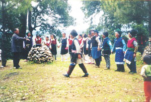 節(jié)日一大早,各家各戶便到供奉藥仙的樹林中,環(huán)藥仙的化身——一堆奇石或一棵古樹歌舞、供祭。隨后,人們各自相約成組,背籃荷鋤,唱著《采藥歌》,游山采藥。若遇到要采、挖的植物,小組中年歲最長(zhǎng)的人,會(huì)在其根部先挖一鋤,然后停鋤唱起《盤歌》:這是一兜草,它叫什么草?用它治啥???藥功好不好?隨之,挖藥者便從小到大,一人回唱一句作答:草名金錢草,采來加工變成寶,味苦、性涼用處多,肝病、尿阻少不了……之后,方采挖這棵藥草。