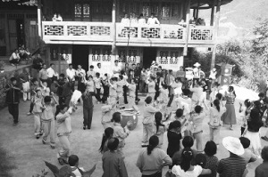 從古至今,每年的正月初九“舍巴節(jié)”(舍巴:土家語擺手舞的意思)、三月三“祭祖節(jié)”、“冬至會”,土家人都要在擺手堂舉行盛大的祭祀活動。農(nóng)閑時的夜晚,在農(nóng)家院壩,點燃熊熊篝火,男女老少在有奏的鑼鼓聲中歡快地舞蹈,盡情地歌唱。清代文人彭施鐸在《竹枝詞》中載:“福石城中錦作窩,土王宮前水生波,紅燈萬盞人千疊,一片纏綿擺手歌?!绷攘葦?shù)語把土家人跳擺手舞的盛況真實地展現(xiàn)出來。