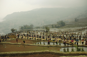 2009年3月1日,“中國(guó)紅河·元陽(yáng)2009年哈尼梯田文化旅游節(jié)”在被譽(yù)為“梯田之鄉(xiāng)”的云南元陽(yáng)縣開(kāi)幕。作為此次旅游節(jié)主體之一的大型高原稻作農(nóng)耕文化千人田野實(shí)景表演——《哈尼梯田》在此間隆重上演。在《哈尼梯田》中,哈尼人一直賴(lài)以生產(chǎn)、生活的田野——梯田,成了一個(gè)宏大的舞臺(tái),不僅展示著哈尼族的歷史和現(xiàn)在,更成了少數(shù)民族群眾情感表達(dá)的載體。