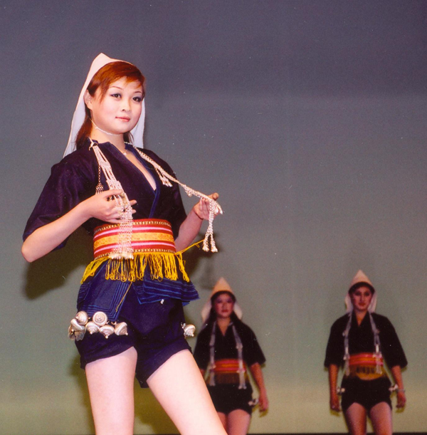 1. 葉車支系 。 葉車婦女的服飾很有特色。紅河縣葉車婦女一般頭戴白尖帽,上衣是靛青色對開式短袖,無領(lǐng)無扣的土布衣,用寬寬的五色腰帶扎腰。布衣是一件一件地套著穿,少則七八件,多達(dá)十余件,里長外短可以看出衣服的件數(shù)。下身穿黑色短褲,褲腳口打上適當(dāng)?shù)鸟藜y,褶紋數(shù)與上衣數(shù)大致相等,大腿以下全部裸露。