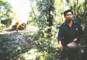 進(jìn)入墓葬地,茂盛的野草,蔽日的樹林,不時進(jìn)入眼簾的墳堆,還有一伸一縮往人腳上爬的螞蟥,讓人毛骨悚然。來到一塊剛砍過的開闊地,中央挖了一個坑,里面滿是倒插著的樹柴,柴堆上還放著兩個舊汽車輪胎。巖化告訴我說:“一次火葬需要兩拖拉機(jī)柴,如果死者家里沒有柴,我們就會每家湊一兩根,直到湊夠?yàn)橹埂S密囕喬ナ菫榱烁玫娜紵?。”人們把棺材停放在柴堆的左?cè),將“恒叫”取下,巖約將棺材蓋板掀開,用從家里帶來的一個竹筒里的水朝死者臉上倒。巖約告訴我:“這是給死者洗臉,幫她打扮一下。”然后,大佛爺開始念經(jīng),經(jīng)文的大意是:“山上的神啊,我們的親人到這里居住,你們要好好服侍她,把周圍看管好!邪惡的鬼啊,這里是我們親人應(yīng)有的地盤,你們不得侵犯,你們不要來擾亂!”念完,就一個人先走了。然后,人們雙手合掌,掌中緊握一根蠟條,圍著轉(zhuǎn)了三圈,婦女們也先走了。邊走還邊相互告誡,不要回頭看,不然死人的鬼魂會跟著你走。剩下的男人將棺材抬上柴堆,將用白布裹著的死者,頭朝寨子,腳朝外,意思是你已從寨子出來了,以后再也不準(zhǔn)回寨子了。用柴壓著,又把棺材砸碎,將棺材碎片也堆放上去,有人就拿來一個塑料桶,開始往上潑澆柴油,并從寨子的這方先點(diǎn)火。一會兒,熊熊的大火便燃燒起來。有人拿著用礦泉水瓶子裝著的酒給大家倒,輪流喝。喝過一圈后,他們摘下一枝樹枝,往自己的衣襟前后拍打一陣,將樹枝扔進(jìn)火里。巖化說:我們要走了,這樣做是把身上的鬼氣趕盡。我也敢緊學(xué)著他們的樣子做了一通,便隨人們離去。