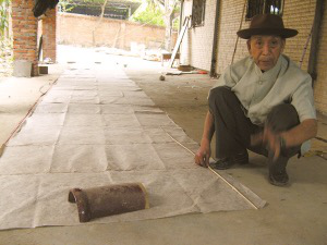 巖妞說(shuō),制作孔明燈最主要的材料是傣族的棉紙和竹編。棉紙來(lái)源于木棉樹(shù)。傣家人摘取木棉樹(shù)的樹(shù)葉并用牛油來(lái)煎熬,使之變?yōu)榘蛋咨臐{汁,待熬熟之后便拿到河邊沖洗,把其中的灰塵和沙粒洗凈。隨后,將洗凈的木棉樹(shù)漿汁攤均勻后在陽(yáng)光下曝曬,曬干后便能拿來(lái)制作孔明燈了。一般的紙很容易被燒壞,而這種手工制作的棉紙韌性好,不容易撕裂和燒壞。