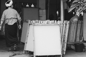 澆紙是在紙槽中進(jìn)行的,不但需要強(qiáng)勁的臂力,還需要相當(dāng)?shù)募?xì)心。在紙槽中舀水的時(shí)候,雙臂承受的重量不下10公斤,紙要澆得恰到好處,澆輕了紙就太薄,澆重了紙又太厚。太薄出不了好品相,太厚會(huì)增加成本。這是整個(gè)構(gòu)紙成品的關(guān)鍵,經(jīng)驗(yàn)老到的傣族老人,都不會(huì)在這道工序上馬虎。一雙手游走在澆紙槽,或輕輕拍打,或慢慢游弋,絮狀的纖維時(shí)而附著在手上,時(shí)而又歡呼雀躍地散開,頑皮得有點(diǎn)像芒團(tuán)村水塘邊遇上的那些孩子。憑感覺均勻了,老人這才輕輕將澆紙盤脫離水面,一眨眼功夫,一張構(gòu)紙便在盤上現(xiàn)出端倪。接下來的事就交給陽光了,如果雨季來臨,構(gòu)紙就停止生產(chǎn)。所以說,芒團(tuán)構(gòu)紙常常浸漬著一種陽光的味道。