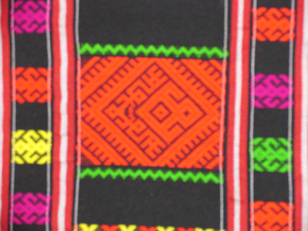 黎錦花紋圖案豐富多彩,多達(dá)百余種。較有代表性的圖案有人物類圖案、動(dòng)物類圖案、植物類圖案、天體類圖案、器物類圖案、文字類圖案。其中,“人物類圖案”是黎錦的基本核心、中心圖案,它在各種織錦中永遠(yuǎn)居于中心位置,形成中心紋飾,其他圖案可根據(jù)需要,或放在它的周邊,或放在它的第三、第四等位上。人物類圖案有單個(gè)的,也有多個(gè)組合的,有全身的,也有半身和頭像的;同時(shí)也有復(fù)合圖的。復(fù)合圖像上,有三重人物圖像嵌套,大套中,中套小,形成復(fù)合效果,構(gòu)圖復(fù)雜,工藝精湛。人物類圖案即祖先紋或鬼紋,黎族民間管這類紋樣叫做“剖”、“登”,即“祖先”或“鬼”的意思。黎錦中的人物紋樣的定位,反映了黎族人的濃厚的祖先崇拜意識。
