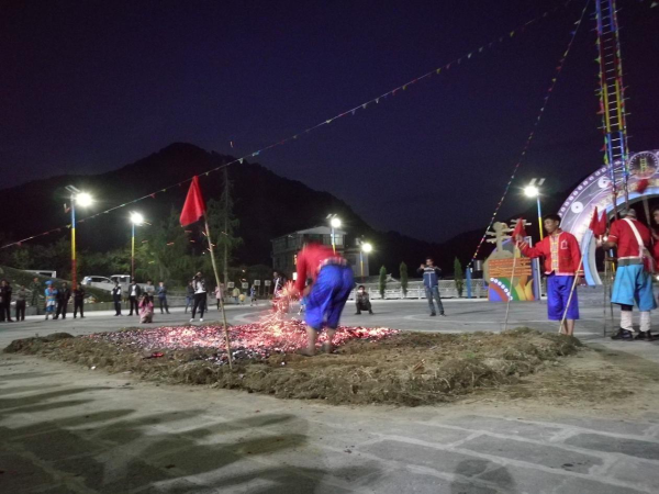 上刀山、下火海,是傈僳族民間的傳統(tǒng)民俗活動(dòng),是其傳統(tǒng)節(jié)日“刀桿節(jié)”上的主要表演項(xiàng)目。傈僳族的“刀桿節(jié)”源于一種原始的宗教活動(dòng)。早期在“刀桿節(jié)”上表演上刀山、下火海的勇士們,都得聽(tīng)命于巫師。上刀山、下火海之前,有一套繁瑣的宗教祭祀儀式。而且每個(gè)上刀山、下火海的勇士身上都要掛上幾十條巫師畫的符咒,使這一活動(dòng)蒙上了濃厚的宗教色彩。經(jīng)過(guò)改革的傈僳族的“刀桿節(jié)”,一般于每年二月初八舉行,屆時(shí),上刀山、下火海就是表演的重要內(nèi)容。上刀山之前,人們首先豎起兩根20 多米長(zhǎng)的筆直的松樹桿。在樹桿之間順序捆上36 或72 把鋒利的刀刃向上的鋼刀作梯子。表演開(kāi)始后,表演者赤手光腳,蹬上梯子頂端,并要做些“蜻蜓倒立”“飛燕迎春”等高難動(dòng)作。下了刀桿后,勇士們還要赤裸著上身、光著腳跳入熊熊烈火中,甚至用身體滾壓火海,直至炭火逐漸熄滅為止。此后,群眾性的娛樂(lè)活動(dòng)就開(kāi)始了,唱歌跳舞,呈現(xiàn)出節(jié)日的歡樂(lè)氣氛。上刀山、下火海,是經(jīng)過(guò)表演者長(zhǎng)期的武術(shù)和氣功訓(xùn)練才能完成的。這一活動(dòng)也表現(xiàn)出傈僳族人民機(jī)智、勇敢、知難而進(jìn)的優(yōu)良品質(zhì)。