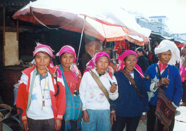 而婦女們的裝束特點(diǎn)分明與眾不同。最突出的是頭戴寬約3公分左右的銀箍,留長(zhǎng)發(fā);身著靛青色無領(lǐng)大襟右衽及橫條花筒裙。腰系紅布寬腰帶和數(shù)十根細(xì)藤圈。耳掛垂肩圓形大耳環(huán),頸戴銀質(zhì)大項(xiàng)圈,細(xì)項(xiàng)鏈。上了年紀(jì)的人,喜歡戴長(zhǎng)約五公分傘狀大耳筒,筒頂還刻有各種花紋。有的婦女在耳筒內(nèi)插上香花香草,有的放上人民幣,出門趕集,隨用隨取,很是便利(上下兩圖由劉軍供圖)。