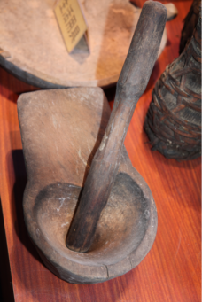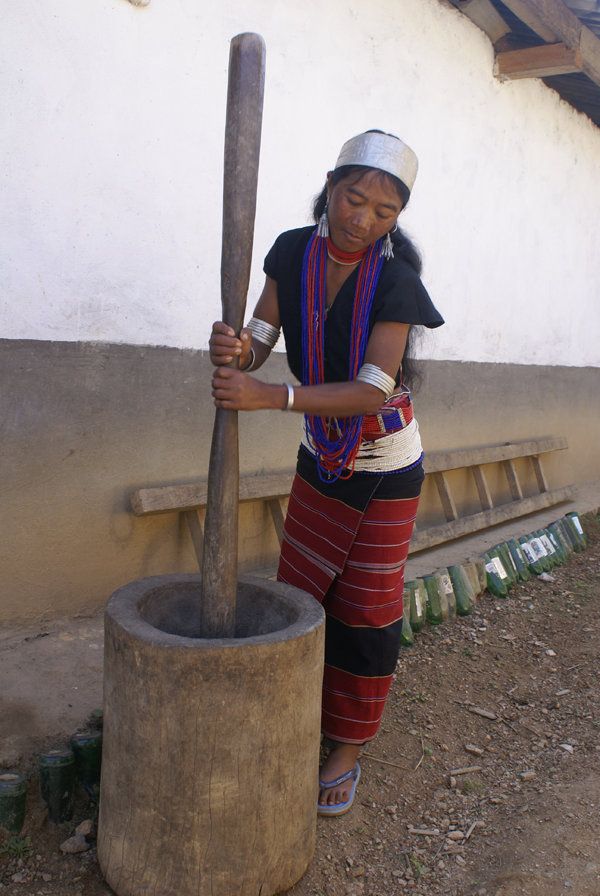 佤族以大米為主食。西盟地區(qū)的佤族都喜歡把菜、鹽、米一鍋煮成較稠的爛飯。其他地區(qū)的佤族則多吃干飯。農(nóng)忙時日食三餐,平時吃二餐。雞肉粥如茶花稀飯是家常食品的上品。旱稻多現(xiàn)吃現(xiàn)舂,男女老幼皆食辣椒,民間有“無辣子吃不飽”之說。副食是青菜類、瓜類、酸竹筍、鹽、辣椒、蔥、蒜等。肉食主要是牛、豬、雞、狗以及獵獲的獸、禽、松鼠、田鼠、魚、螺螄、螃蟹、蜂兒等。一些地區(qū)的佤族還有捕食昆蟲的習(xí)慣,更食用蛹、寄生于草木植物的紅毛蟲、掃把蟲和寄生于冬瓜樹的冬瓜蟲等十余種。一般是把可食的昆蟲與米一起煮成粥,加菜、鹽、拌辣椒,香辣可口(兩圖為舂米和舂米用具,劉軍攝影)。