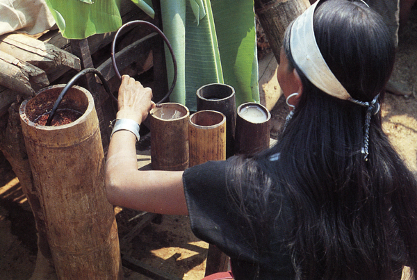 佤族普遍喜飲酒,喝苦茶。所飲用的酒都是自家釀制的“泡水酒”。常飲泡水酒不但于身體無害,反而有益健康。飲水酒成為佤族日常生活中主要的嗜好之一。喝酒時必須要請親友來家中共飲,主人給客人敬酒有一套規(guī)矩:必須一一敬酒。敬酒時,雙手捧竹酒筒,走到客人面前,弓身把酒筒從自己胸前按下再向上舉到客人嘴邊,主人喝一口,最后敬給客人喝干。如此一一敬酒,直至敬完所有在場的人,漏敬一個,都會被認為是不合“阿佤理”的。敬酒時,第一個被敬酒的人,通常是在場的客人中最被尊重的人。他接過酒后,先要用右手沾出幾滴,滴在地上,并口念祝福的語言,表示敬主人的祖先(圖為用竹筒制水酒,劉軍攝)。