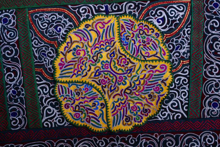 珍藏于民族文化宮博物館的這件水族馬尾繡背兒帶,是水族婦女背負兒童的工具,于20世紀80年代征集于貴州...
