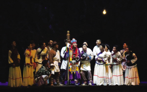 話劇《巴交龍布》由著名導(dǎo)演查麗芳擔(dān)綱總導(dǎo)演。為了實(shí)現(xiàn)戲劇擅長的表達(dá)方式,該劇把與巴交龍布同行的騾子作了擬人化處理,將這對“難兄難弟”的經(jīng)歷作為貫穿全劇的一條主情節(jié)線。在雙方的對話交鋒中,既有喜劇的幽默,又有正劇的嚴(yán)肅。同時,納西族傳統(tǒng)文化也得到了豐富的體現(xiàn)。劇中,不僅有盛大的納西族婚禮、神圣的東巴祭祀儀式、歡快的納西族歌舞,還有對納西族信守承諾、吃苦奉獻(xiàn)等民族精神的彰顯。