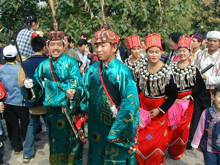目瑙節(jié):又稱“總戈”,景頗語音譯,意思是“大伙跳舞”。目瑙節(jié)是景頗族最盛大的傳統(tǒng)節(jié)日,一般于每年農(nóng)歷正月十五以后的九天內(nèi)擇雙日舉行,節(jié)期三至五天不等。目瑙作為一種大型的群眾性歌舞活動(dòng),由來已久,歷史上,每逢豐年,出征、凱旋、婚姻嫁娶、敬祭鬼神等重要活動(dòng),均要跳“目瑙”。景頗族的“目瑙縱歌”原來是一種融宗教和文化習(xí)俗為一體的傳統(tǒng)慶典。隨著社會(huì)的發(fā)展,逐漸演化為各種不同類別的“目瑙”。大致有以下幾種:①“歲目瑙”,家庭財(cái)源茂盛,人丁興旺時(shí)舉行;②“布當(dāng)目瑙”,征戰(zhàn)取得勝利時(shí)舉行;③“貢冉目瑙”,同胞兄弟分家自立門戶時(shí)舉行;④“騰肯目瑙”,新建房屋住所落成時(shí)舉行;⑤“空然目瑙”貴族家娶親辦婚禮時(shí)舉行;⑥“達(dá)如目瑙”,出征時(shí)舉行;⑦“昔目瑙”,有名望的長(zhǎng)者去世送葬時(shí)舉行;⑧“柱目瑙”,祭奠“木代”神時(shí)舉行。不同類別的“目瑙”都有特定的內(nèi)容和表現(xiàn)形式,但有一個(gè)共同點(diǎn)就是整個(gè)過程都是由“瑙雙”(領(lǐng)舞)隊(duì)和“瑙巴”(表演)隊(duì)組成的舞隊(duì)來表現(xiàn)和完成的。每逢目瑙節(jié)日,村村寨寨的景頗人身著節(jié)日盛裝,紛紛從四面八方涌入目瑙廣場(chǎng)。廣場(chǎng)上人山人海,氣氛熱烈歡快而不失莊嚴(yán)古樸的特色。廣場(chǎng)中央高豎著四根長(zhǎng)約4米的目瑙柱,亦稱雌雄柱,中間兩根為陰,外面兩根為陽(yáng),上面皆繪有精美而富有象征意義的圖案:右邊柱上往往繪以蕨菜花紋,象征團(tuán)結(jié)奮進(jìn);左邊常畫回紋構(gòu)成若干個(gè)四方形,并涂以不同顏色,表示景頗族的遷徙路線;中間兩根柱子之間,交叉著兩把長(zhǎng)刀,為景頗民族驍勇強(qiáng)悍、堅(jiān)強(qiáng)剛毅性格的具體標(biāo)志。目瑙柱的左側(cè)立著一個(gè)方形架子,上層是吹嗩吶的座位;前面掛著一個(gè)兩米長(zhǎng)的大皮鼓和一面直徑一米多的大芒鑼,供跳舞時(shí)伴奏用。廣場(chǎng)四周用竹籬笆圍起,目的是為了防止野鬼的侵入和牲畜的干擾。舞蹈開始時(shí),鼓樂齊鳴,由兩位德高望重且又熟悉目瑙舞路線的老人身穿大龍袍,頭戴飾有孔雀、野雞羽毛和野豬牙齒的目腦帽,手持長(zhǎng)刀領(lǐng)頭,后面跟著背銅炮和持長(zhǎng)刀的隊(duì)伍,婦女們拿著扇子或彩帕跟在最后,邊歌邊舞,熱鬧非凡。參舞者少則百多人,多則幾千人,從清晨到日暮,以日暮到清晨,通宵達(dá)旦,其間舞者跳累時(shí)可自動(dòng)退場(chǎng)小歇片刻,然后繼續(xù)登場(chǎng)舞蹈?!澳胯Эv歌”作為一個(gè)民族的傳統(tǒng)活動(dòng)發(fā)展至今,宗教色彩和類別已日益淡化,它已成為景頗族約定俗成的傳統(tǒng)節(jié)日,統(tǒng)稱為“統(tǒng)肯(傳統(tǒng))目瑙”并賦予了新的內(nèi)涵,其內(nèi)容和形式都是展示一個(gè)民族的傳統(tǒng)文化,反映今天的新生活和對(duì)未來的美好向往。