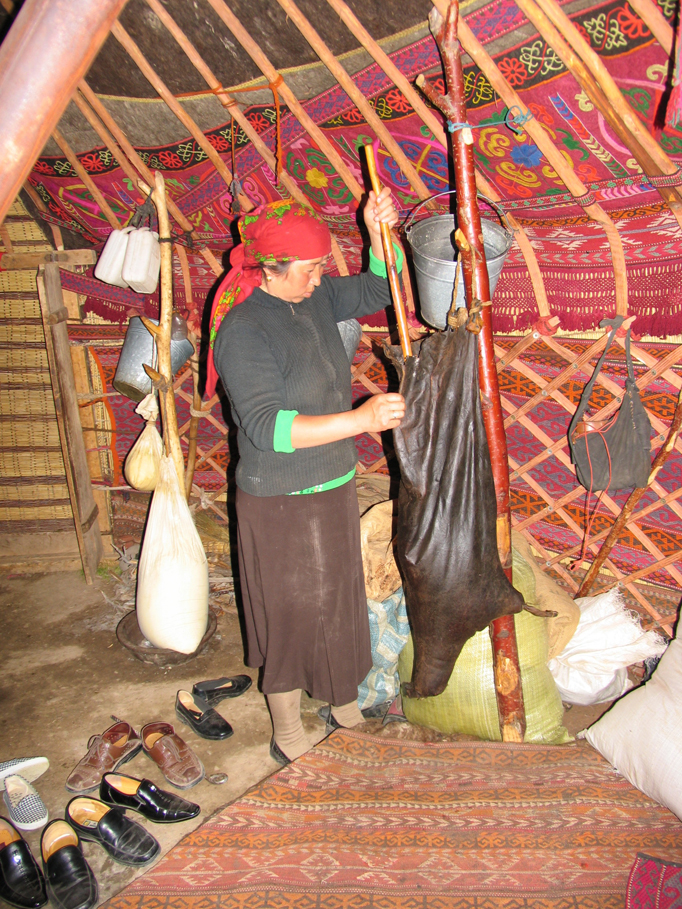 搗酸奶的柯?tīng)柨俗螊D女(劉軍攝)