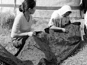 秋來春往,花落花開,瑪利亞從小女孩長成大姑娘,她的繡藝也日漸嫻熟,結(jié)繡、鉤繡、扎繡、刺繡、串珠片繡、格子架繡、十字繡……在日復(fù)一日的飛針走線中,她練就了一雙巧手和溫柔內(nèi)斂的性格。瑪利亞繡花,先勾勒花朵的輪廓,再用細(xì)的色線填滿輪廓內(nèi)的空間,由外向內(nèi),一圈一圈、一層一層,直到色彩飽滿的圖案凸現(xiàn)出來。草原上黃色的野菊、白色的蒲公英、藍(lán)色的薰衣草、紅色的刺玫,都像被擷取了精靈似的,綻放在柯爾克孜女人的繡品中,流露出她們與自然界溫暖而平和的情感交流。