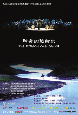 作為內(nèi)蒙古自治區(qū)莫力達(dá)瓦達(dá)斡爾族自治旗(以下簡稱“莫旗”)慶祝建國60周年的活動之一,2009年3月26日至27日,北京保利劇院迎來了一場名為《穿越千年——神奇的達(dá)斡爾》(以下簡稱“《神奇的達(dá)斡爾》”)的大型文藝演出。這臺主要由烏蘭牧騎傾情奉現(xiàn)的演出分《亙古風(fēng)云》、《山魂水魄》、《日月同歌》、《天地祥和》、《陽光燦爛映山紅》5部分,分別展現(xiàn)達(dá)斡爾族在歷史、文化、藝術(shù)、體育等多方面的成就和風(fēng)情,可謂一場立體的非物質(zhì)文化遺產(chǎn)展覽。