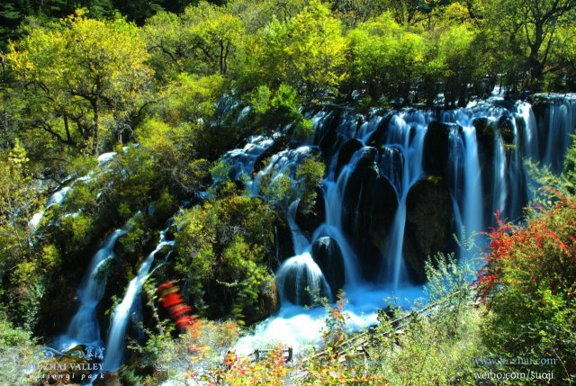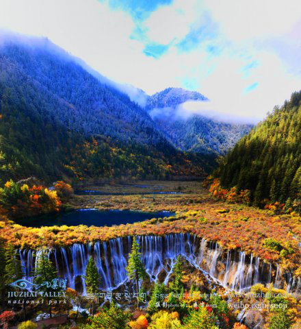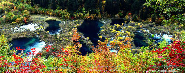 九寨溝四周群山聳峙,有雪峰數(shù)十座,高插云霄,終年白雪皚皚。河谷地帶奇水薈萃,其間有成梯形分布的大小湖泊114個(gè),瀑布群17個(gè),鈣華灘流5處,泉水47眼,湍流11段,以1870米的海撥高差,在12 座雪峰之間穿林跨谷,珠連玉接,呈Y字型串珠,逶迤近60公里,形成了中國(guó)唯一、世界罕見的以高山湖泊群和瀑布群以及鈣華灘流為主體的風(fēng)景名勝區(qū)。湖泊小者數(shù)平方米,最大的長(zhǎng)海長(zhǎng)達(dá)7公里。湖水終年碧藍(lán)澄澈,色彩斑讕,在陽(yáng)光照射下,呈現(xiàn)出藍(lán)、黃、橙、綠等多種色彩,絢麗奪目。天氣晴朗時(shí),藍(lán)天、白云、雪山、森林倒映湖中,水光浮翠,美麗如畫,并隨季節(jié)推移呈現(xiàn)出不同的色彩和風(fēng)韻,有“九寨歸來(lái)不看水”之說(shuō)。