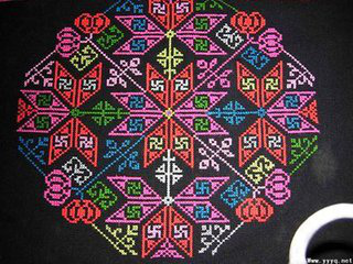 刺繡針法主要有鎖繡、平針繡、參針繡、壓針繡和眉毛花、納紗繡、補花繡、十字繡、編針繡、牽花繡、緝針繡、云子花等。鎖繡針法采用繡線環(huán)圈鎖套而成,即線線成環(huán)、針針套扣,落針在起針旁,最后繡成的紋路效果如鎖鏈結構,因而得名鎖繡。羌族鎖繡發(fā)展成為各式針法,并成為羌族刺繡的重要針法。鎖繡主要運用于圍腰上的裝飾紋樣,平針繡又稱“齊針繡”,是繼鎖繡之后另一種古老而傳統(tǒng)的針法。平針繡的繡線排列整齊均勻,不露地、不重疊,以繡跡的絲理顯現紋飾的質感,繡紋具有閃光緞面的效果,多用于小塊面的刺繡。參針繡又稱“套針繡”,是在平繡的基礎上增加深淺變化,以表現花、葉等紋樣的明暗,使大面積的紋樣層次豐富而有立體感。在平繡和參針繡的基礎上,羌族婦女創(chuàng)造了壓針繡的針法,她們又稱之為“撇花”。在繡一針長線后,又用一針短線壓在原長線上,并確保每繡一針長線后均在同一位置壓上短線,如編籬笆一般,紋樣邊緣整齊,紋樣內的繡線交錯有致,產生富有變化的視覺效果。穿花繡、九針繡,多用于頭帕以及飄帶上。納紗繡的針法是在素色面料上按經緯紗線交織的孔進行刺繡,并沿著一個方向施針,如垂直的經線方向或水平的緯線方向,通過露出面料地色而形成花紋。補花繡又稱貼花繡、貼布繡。羌族婦女稱之為“拼花”,即將色布拼接后形成花紋。補花繡制作簡便,紋樣簡潔大氣,裝飾效果強烈。制作時,將剪好的色布貼于服裝、鞋面所需要裝飾的部位,然后用鎖扣繡、結邊繡或緝針繡的針法固定色布。十字繡又名挑花、架花、數紗繡,在羌繡中占有重要地位,十字繡繡品種類多、數量大、表現的內容非常豐富。羌族十字繡,既有嚴密的構圖,又有豐富的內容、對比的色彩和精彩的紋樣,還有精煉而靈活的針法。類似十字繡的刺繡,繡線相互編織、交錯、重疊,繡線排列、交織勻稱,交錯的繡線如同編織的網,可形成各種塊面和線條。牽花繡又稱“纖花”、“兩面花”、“里面花”,即采用單根繡線,繡針按面料的經緯線走向,有規(guī)律地來回穿刺,形成上針、下針、順針、回針,繡出的圖案在面料的里和面均呈現規(guī)則的幾何形花紋。緝針繡以回針法運針,即針腳頭尾相接,因此民間又稱為“倒鉤針”。緝針繡要求針腳長短均勻整齊,繡紋自然流暢,此針法多用于補花繡,將補繡的布片固定在裝飾部位。云子花又稱“云云花”,多用于云云鞋鞋面上補花圖案的裝飾。因此,“羌族刺繡既繼承了傳統(tǒng)針法豐富而又嚴謹的特點,又體現了本民族刺繡針法的靈活性與多樣性。