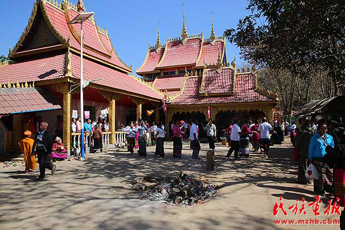 生活在我國西南邊疆的布朗族節(jié)日期間要舉行很多文化活動(dòng),布朗族同胞與親朋好友相聚一堂,品嘗美味佳肴并舉行歌舞表演。臨近中午,位于曼夕村前山頂?shù)乃聫R已人頭涌動(dòng),院子里人們圍成圈邊打鼓邊跳舞,緩緩移動(dòng)的優(yōu)美舞姿成為一道靚麗的風(fēng)景。