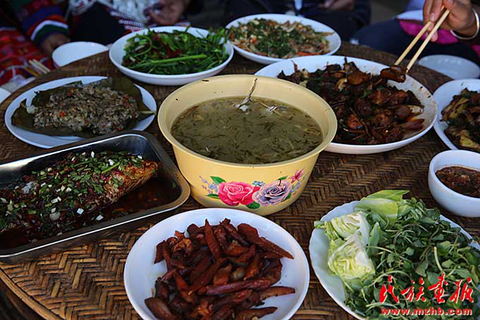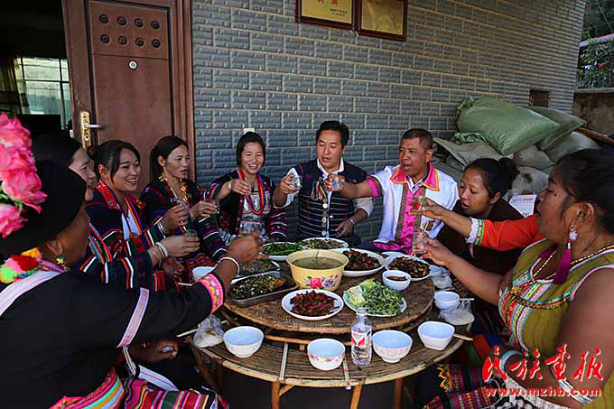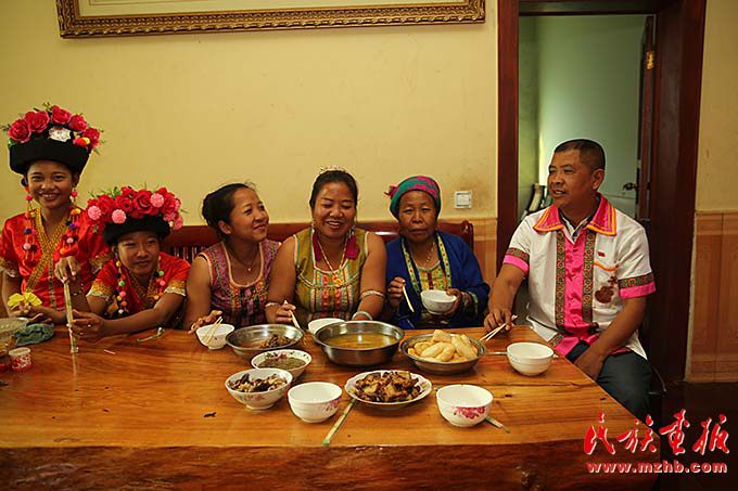 在曼夕村,民族傳統(tǒng)節(jié)日已成為不同民族間聯(lián)絡(luò)增進(jìn)感情的最佳時(shí)機(jī)。曼夕村村主任車達(dá)告訴記者,他自己是哈尼族,村里還有漢、布朗、哈尼等民族。40多年前,為了種植橡膠樹布朗族與彝族遷徙過來生活在一起,幾十年來,兩個(gè)民族相互尊重對方的生活習(xí)慣,過年過節(jié)相互走動(dòng)拜訪,互相通婚成為一家人。晚飯時(shí),記者在曼夕村村支書巖坎硝家里聚餐時(shí)看到車達(dá)帶著幾個(gè)哈尼族婦女盛裝出席,宴會(huì)上人們相互祝賀,唱敬酒歌。哈尼族婦女圖處告訴記者,哈尼族過傳統(tǒng)節(jié)日,布朗族村民要來慶賀,布朗族過節(jié),哈尼族人也去祝福,幾十年來一直如此。