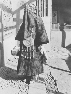 照片中的人物,是青海循化街子工附近一位即將出嫁的新娘。照片拍攝時間是1932年2月,地點是霍頓居住的院落。