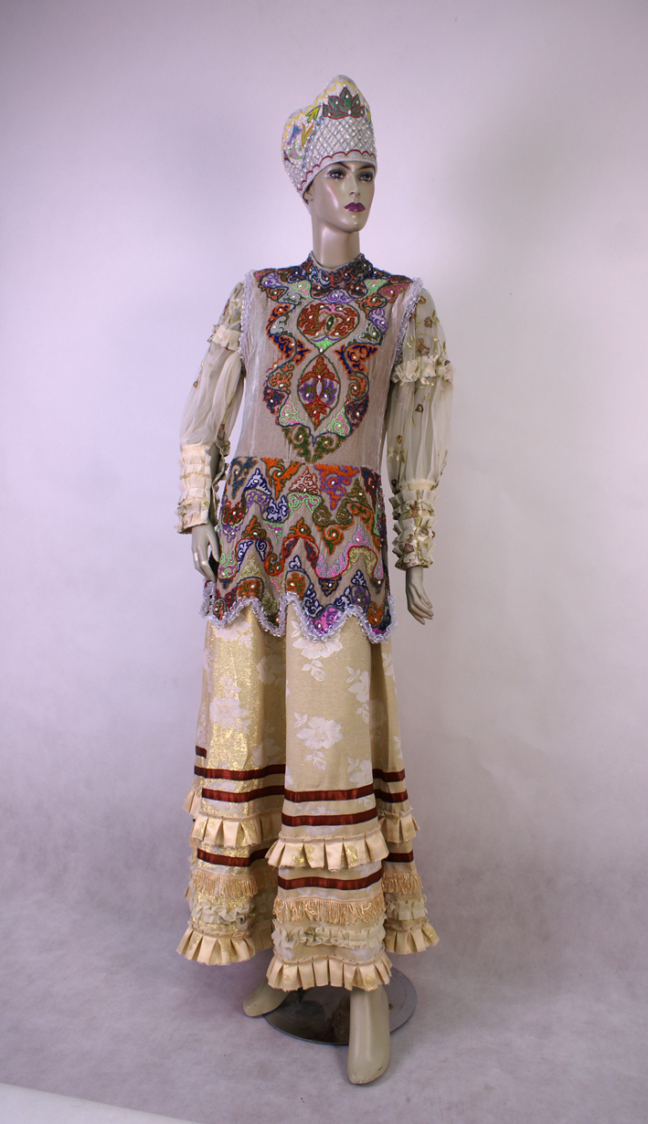 俄羅斯族女性的服飾則更多的體現(xiàn)了女性美,她們在重大節(jié)慶或節(jié)日時會穿上絲綢質(zhì)地的繡花襯衣,外面再套穿一件無袖、腰身較高的對襟長衫,下身一般穿著毛織長裙。俄羅斯族女子也十分喜愛穿長筒皮靴或氈靴。俄羅斯族女性的發(fā)飾也視年齡的不同而有所差異,少女梳獨辮,把彩色發(fā)帶和小玻璃球編在辮子里,頭發(fā)可外露。已婚婦女則梳兩條辮子,盤于頭頂,再用頭巾或帽子罩上。