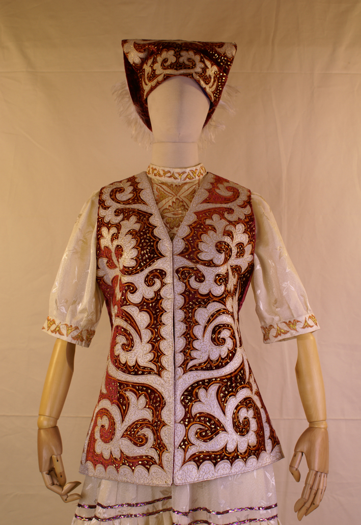 俄羅斯族女性的服飾則更多的體現(xiàn)了女性美,她們在重大節(jié)慶或節(jié)日時會穿上絲綢質地的繡花襯衣,外面再套穿一件無袖、腰身較高的對襟長衫,下身一般穿著毛織長裙。俄羅斯族女子也十分喜愛穿長筒皮靴或氈靴。俄羅斯族女性的發(fā)飾也視年齡的不同而有所差異,少女梳獨辮,把彩色發(fā)帶和小玻璃球編在辮子里,頭發(fā)可外露。已婚婦女則梳兩條辮子,盤于頭頂,再用頭巾或帽子罩上。