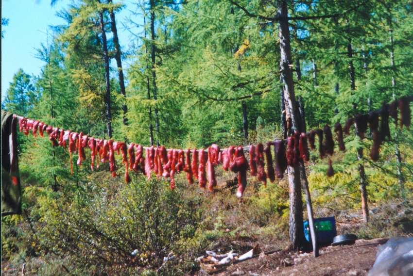鄂溫克族人的飲食根據(jù)居住地的自然環(huán)境有所不同。林區(qū)的鄂溫克族完全以肉類作為日常生活的主食,主食包括罕達(dá)犴肉、鹿肉、熊肉、野豬肉、狍子肉、灰鼠肉,飛龍、野雞、烏雞、魚類等,其中鹿、狍子的肝、腎一般都生食,其他部分則要煮食。牧區(qū)的鄂溫克族以乳類和乳制品為主食,其中比較特別的食物是奶茶。