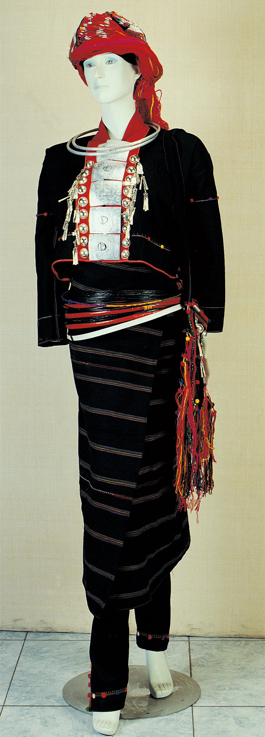 “藤篾腰箍”最醒目的是套在婦女腰間的藤蔑圈,又被稱為“腰箍”。早在德昂族的創(chuàng)世古歌中,就有“腰上箍著藤圈的姑娘靠得住”的說法,德昂族通常把佩戴腰箍的數(shù)量作為衡量姑娘心靈手巧的標志。從清代,德昂族從古代蒲人中分化出來,劉毓坷在光緒年間的《永昌府志》卷五十七順寧府記載,崩龍族人“女以尖布套頭,以藤蔑圈纏腰,漆齒紋身”。而現(xiàn)在其他民族以藤蔑圈纏腰的習俗早已不復(fù)存在,只有德昂族的這一習俗延續(xù)至今(圖為德昂族傳統(tǒng)銀牌扣竹篾腰箍女服,中央民族大學(xué)民族博物館館藏)。