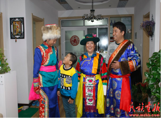 在肅南裕固族自治縣各民族如同一家人。這一家有三個民族,媽媽是土族、兒子是裕固族、兒媳是藏族,一家人其樂融融。 引自民族畫報