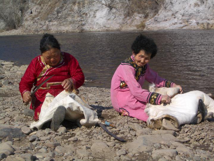 鄂倫春人過去在家庭公社“烏力鄰”里,同生產(chǎn)共消費,在當時生產(chǎn)力十分低下的情況下,憑著扎槍和弓箭,單個人很難獲得能夠滿足衣食需要的獵物,必須要有“烏力鄰”全體成員的通力合作,才能戰(zhàn)勝兇猛和龐大的野獸,所以,在“塔坦達”領導下的集體狩獵是當時最主要的勞動形式。隨著生產(chǎn)力的不斷發(fā)展和個體小家庭的大量流動,不僅社會組織“烏力鄰”由原來血緣性的家庭公社演變?yōu)榈鼐壭缘牡赜蚬?,勞動組織也隨之發(fā)生了極大的變化。集體狩獵已不再是“烏力鄰”傾巢出動,而是由幾個小家庭的成員自愿結合成“安嘎”來進行。同時還出現(xiàn)了集體和個人等多種勞動形式。狩獵也不再單純是為了滿足衣食的需要,剩余獵物可以拿去交換,獵產(chǎn)品已趨于商品化。故此時一些珍貴的細毛皮張和藥用價值較高的獸類,成了鄂倫春人主要的狩獵目標。這樣就形成了一年中的四個狩獵旺季,即:農(nóng)歷正月至2月是“鹿胎期”;4月至6月是“鹿茸期”;9月至落雪為“叫鹿尾期”;落雪后至來年開春是“打皮子期”。大概是源于原始的圍獵,鄂倫春人把狩獵叫“打圍”,而這四個狩獵旺季就叫“紅圍期”?!凹t圍期”除“叫鹿尾期”外,都組織“安嘎”集體出獵?!鞍哺隆笔且环N臨時性的狩獵組織,狩獵旺季將臨時,由一人發(fā)起,串聯(lián)幾位親朋好友或志趣相投的人組成一個“安嘎”,待獵期結束,“安嘎”自行解散,下次出獵時再重新組合,因此其成員并不是固定的(圖為熟化狍皮,吳雅芝攝影)。