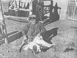 這之后,我們來(lái)到鄂倫春族的一個(gè)定居點(diǎn)——托河做調(diào)查。托河保留著比較完整的鄂倫春族狩獵文化,男人們打獵、捕魚(yú),女人們則負(fù)責(zé)做飯、熟獸皮、用皮子做衣服等。女人縫獸皮衣時(shí),用的針還是骨針,線則是野獸的筋。當(dāng)然,她們還用樺樹(shù)皮做各種生活用品,如籃子、盒子、筒子等。