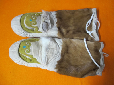 狍皮文化是鄂倫春族創(chuàng)造的比較有特點(diǎn)的物質(zhì)文化之一。其特點(diǎn)主要體現(xiàn)在民族服飾上,可以說傳統(tǒng)的鄂倫春人其服飾從頭到腳多是狍皮制作,如狍皮袍、狍皮襖、狍皮褲、狍皮套褲、狍皮靴、狍皮襪、狍皮手套、狍皮坎肩、狍頭皮帽等等。由于鄂倫春人狩獵對(duì)象還有鹿、黑熊等,所以也有少量的用這些動(dòng)物皮毛制作的服飾、被褥等日常用品。