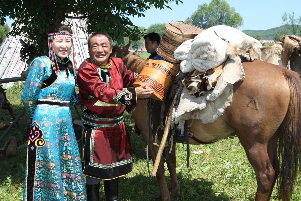 訂婚以后,女方家要為姑娘準(zhǔn)備嫁妝,嫁妝屬于女方私有財(cái)產(chǎn),小兩口可以任意支配,別人無權(quán)干涉,故嫁妝多陪送雌馬,因?yàn)榧迠y馬繁殖的小馬也屬于嫁妝。嫁妝中還有一個制作考究的樺樹皮箱絕對不能少,這個樺樹皮箱鄂倫春語叫“阿達(dá)瑪拉”,有長方形和橢圓形兩種。箱蓋中央刻“南綽羅”花紋,象征夫妻相伴、團(tuán)結(jié)美滿。箱蓋邊沿和箱子四周刻有“奎熱格音”圖案,代表著娘家對女兒的告誡:嫁了人就要忠于丈夫,不能隨便超越規(guī)范。