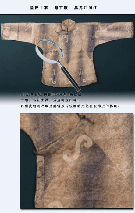 赫哲族的魚皮衣歷史久遠(yuǎn)。我國(guó)古代文獻(xiàn)《山海經(jīng)》第九卷《海外東經(jīng)》中便有“玄股之國(guó),在其(黑齒)北,其為人衣魚食鷗” 的記載。“衣魚”西晉學(xué)者郭璞解釋為“以魚皮為衣也?!闭f(shuō)明早在兩千多年前,赫哲族的先民就已使用魚皮做衣服了。另?yè)?jù)密山新開流新石器時(shí)代遺址中出土的魚叉及骨針,證明赫哲族的先民捕魚和縫制魚皮衣有數(shù)千年歷史了。清代張晉彥的《寧古塔山水記》有:“魚皮部落,食魚為生,不種五谷,以魚皮為衣,暖如牛皮”的記載?!痘是迓氊晥D》記載:“赫哲衣服多用魚皮而緣以色布,邊綴銅鈴,亦與鎧甲相似?!绷硗猓胤街緯鴮?duì)此也多有記載。可見(jiàn),赫哲族制作和穿著魚皮衣是真實(shí)而久遠(yuǎn)的。