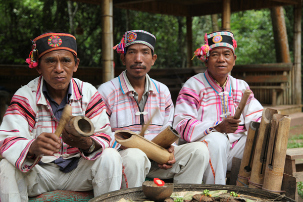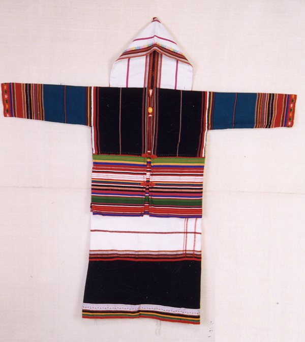 男子身著無領(lǐng)對(duì)襟上衣,多用白底直條紋土布制成,背部縫有繡在白色方塊布上的月亮花圖案。下穿寬大的褲子,長及膝處,用白色土布綁腿。頭上留三撮發(fā),額前正中一撮,頭頂腦門心兩邊各一撮,但有的村寨只留一撮,有的在額正中,有的在頭頂上,長約寸許,用寬一尺、長丈余的黑布纏頭。