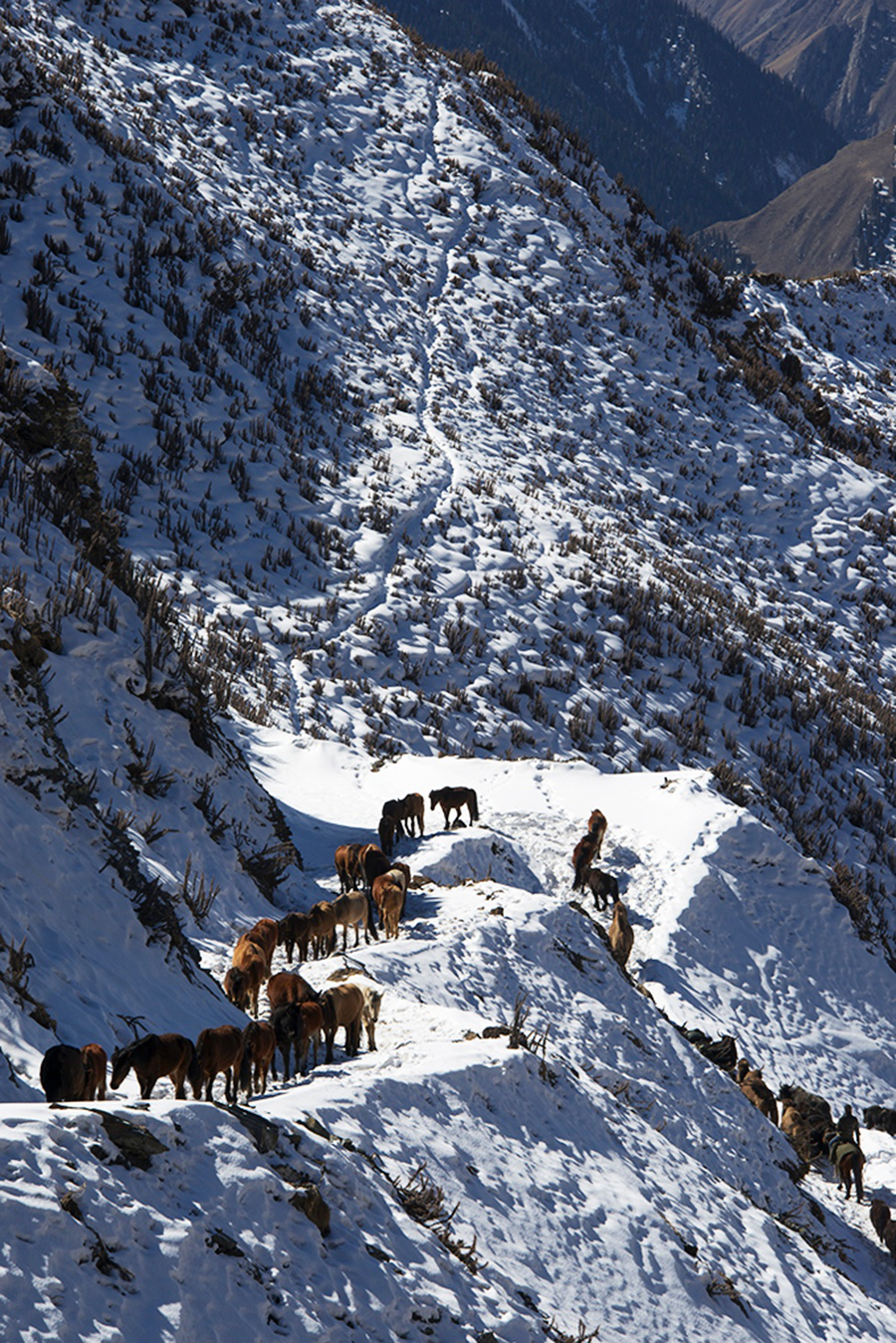 喬隆格爾冬牧場與山外的氣候差異大,暖陽如春。另一個突出特點(diǎn)是草好,草密的地方?jīng)]膝,縱橫倒伏一片,比南方秋田摞在一起的蒲草都密實(shí)??諝馇邃?,腐草味兒、上一年遺留的畜糞味兒和著遠(yuǎn)處高大冰崖透散過來的寒氣撲面而來,最突出的還有野生動物的腥氣,牧羊犬夜夜不停地叫聲在告訴你它們往復(fù)經(jīng)過的頻率。山上能看到大角的北山羊,野鵪鶉被驚到嘩啦啦地飛起一片。若是誰家的羊死了扔在野外,幾天都能看到禿鷲在天空盤旋。最不可思議的是雪豹,光顧一次造成的損失遠(yuǎn)比一群狼大。
