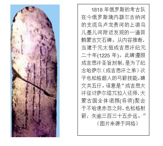 在成吉思汗叱咤風(fēng)云的時代,中國北方與宋王朝并立先后存在過西夏、遼、金、蒙古等少數(shù)民族政權(quán)。這些政權(quán)的主體民族,西夏國的黨項、遼國的契丹、金國的女真、蒙古國的蒙古,都有本民族語言,最初都沒有本民族文字。建立政權(quán)后,為了適應(yīng)政治和文化發(fā)展的需要,他們有的創(chuàng)立了本民族文字,如西夏文、契丹字、女真字等等。回鶻西遷之前,與蒙古共同生活在蒙古高原,他們都是游牧民族,經(jīng)濟文化與許多相似性,語言上同屬阿爾泰語系,分屬蒙古語族和突厥語族,因此蒙古語與維吾爾語的一些日常用語和詞匯是相同或相近的。如黑(哈喇)、黃(霞喇)、金(阿拉泰)在蒙古語與維吾爾語中發(fā)言是一樣的。成吉思汗命塔塔統(tǒng)阿用回鶻字母創(chuàng)建蒙古文字,就是在這樣的時代背景和回鶻、蒙古的文化聯(lián)系上產(chǎn)生的。現(xiàn)存用回鶻式蒙古文寫成的文獻中,最早的是1225年的《也松格碑》(成吉思汗石碑)。