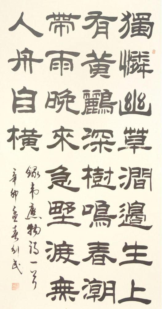 從書法觀念上說,張行民屬于“傳統(tǒng)派”。在傳統(tǒng)中國美學中,劉勰《文心雕龍》中所謂“剛健既實,輝光乃新”是最為健康的生命情調體現?!拔簳x風度”的一個非常重要的審美標志就是人的“骨氣”,無骨氣,則算不上風度。中國藝術從它的凌空高蹈之際,就以骨為美,以氣為尚。書如其人,張行民書法頗顯其“骨”與“氣”,他的隸書胎息于歷代隸書大家的標準書風,取法與劉炳森先生的隸體風格。為領會貫通隸體的本真,他讀帖臨帖如醉如癡,近來參以名家的大氣雍容,風流表格,經過一番整合已初顯“剛健既實,真力彌滿”的個性風采。從字法上講,他取諸家“簡約”之長,以魏體的凌空取勢、大氣超拔以補其不足。從筆法上分析,他慣用高管長鋒執(zhí)中守意,凌空高蹈,筆力遒逸,骨氣峻邁。讀他的字,可以感受到生命氣象的流落、情感意緒的噴發(fā),正是一種趨于壯美意向的審美生發(fā)。若再從點畫的線性質感來看,張行民近作的最大特點是“遒勁厚重,剛健縱逸”。在創(chuàng)作中,情緒的激揚往往左右了他對毛筆的掌控,在控制與時空中,他完成了筆與筆的連帶,線與線的綰結,因此從整體作品看來,渾然一氣,毫不掩飾其一瀉千里之概。